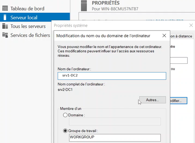Nous allons renommer notre pc en nous rendant sur Server local > Nom de l'ordinateur > Modifier :