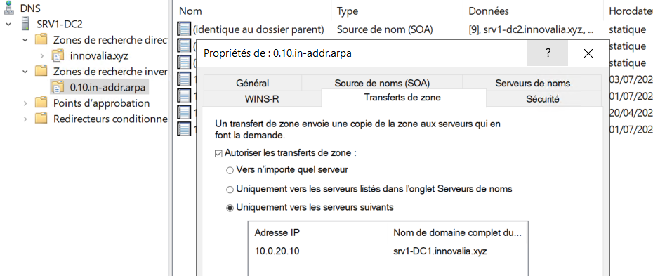 Pour finir, nous allons modifier les transferts de zone pour que les données puissent s’échanger correctement entre nos deux DNS. Pour ce faire nous allons effectuer un clic droit sur notre zone et choisir Propriétés et aller dans l’onglet Transferts de zone pour ajouter l’adresse ip de notre second serveur DNS: