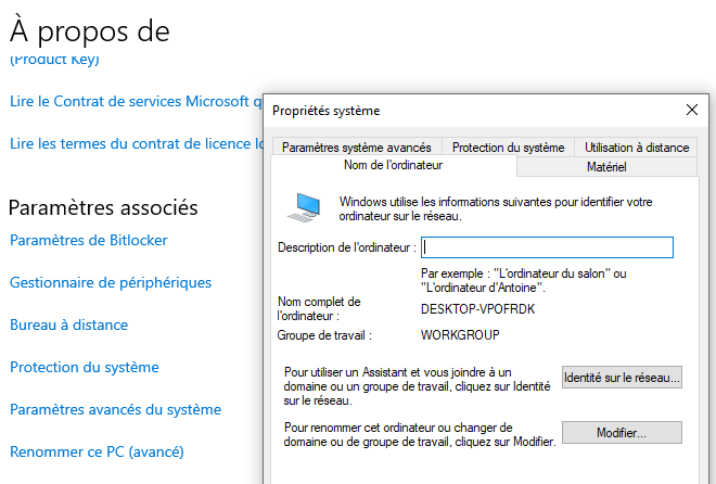 Nous allons ajouter notre pc au domaine en nous rendant sur Paramètres > Système > A propos de > Paramètres avancés du système puis sur l’onglet Nom de l'ordinateur et choisir Modifier.